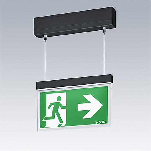 Ultra slim LED escape sign luminaire for suspended, wall or ceiling mounting; recessed ceiling mounting possible with optional recessed ceiling frame; Luminaire for central emergency power supply with 48V DC, for single monitoring of the luminaire via Powerline in connection with the nBox System, settable emergency light level; Non-maintained and maintained mode settable via the central battery system; housing made of polycarbonate black; luminaire easy to install; Quick fit terminal block, through wiring possible up to 2,5 mm²; supplied with a set of ISO 7010 mountable direction signs (left, right, up, down and blank) for viewing from a maximum distance of 23 m; mounting of signs with discrete mounting pins; zero maintenance thanks to LED technology; service life of 50,000 h at constant luminous flux; uniform backlighting of pictogram; luminance > 500 cd/m² in the white region; Luminaire input power: 2.7 W; degree of protection: IP40, class of protection: Class II electrical; Impact strength: Impact strength: IK03; Dimensions: 265 x 37 x 57 mm; weight: 0.96 kg