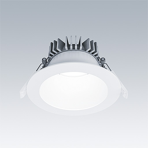Luminaria empotrable LED de baja altura. Adecuado para aberturas en techo Ø145-180 mm para reacondicionamientos sencillos o instalaciones iniciales rápidas. Controlador LED remoto y enchufable Salida fija. Posibilidad de conexión en serie. Cuerpo: fundición aluminio para la gestión térmica. Difusor: policarbonato (PC), reflector liso en acabado blanco con haz ancho. Reflector y moldura: alta calidad, alta reflectividad policarbonato (PC). , IP20. Los clips de muelle son adecuados para espesores de techo de 1 a 35 mm. Con LED 4000K