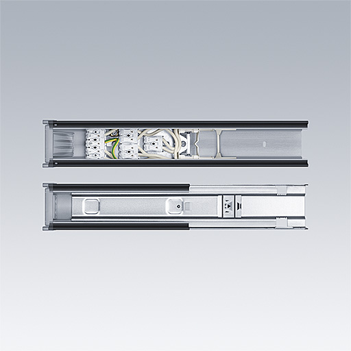 Kit power-feed L500 en negro fabricado de chapa de acero perfilada para conexión eléctrica en fila continua. El kit se compone de dos unidades, una que dispone de bloques terminales para la conexión eléctrica y la otra es una pieza mecánica. Juntas tienen una longitud de 500 mm, que permite que la línea esté completamente equipada y cubierta por luminarias CONTUS. Terminales de conexión enchufables para 5 cables de suministro eléctrico principal, 2 x 2 cables de iluminación de emergencia y 2 lineas de control. Incluye tapas finales y tapas protectoras para evitar un contacto accidental con conductores eléctricos.