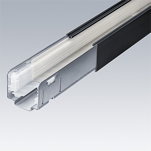 Unidades de canalización de chapa de acero laminado con revestimiento en polvo y barniz de poliéster. 5 líneas de alimentación eléctrica (5 x 2,5 mm²/16 A) más 2 x 2 conductores (4 x 1,5 mm²/10 A) para integrar la iluminación de emergencia usando dos circuitos independientes, más 2 conductores de línea de control (2 x 1,5 mm²/10 A). Conexión sin herramientas usando el kit de alimentación eléctrica.