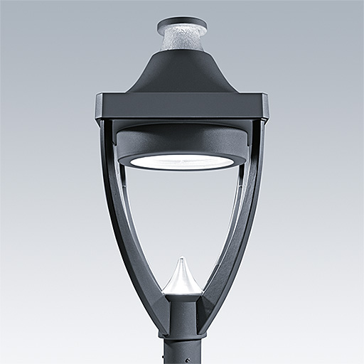 Lanterne LED patrimoine moderne Installation portée avec optique fermée. Electronique. Classe électrique II, IP65, IK08. Corps : aluminium Moulage sous pression thermopoudré gris 900, finition texturé (close to RAL 7043). Boîtier : verre trempé plat. Protection contre les surtensions : 10 kV en mode commun single pulse et 8 kV en mode commun multipulse; 6 kV en mode différentiel multipulse. Si un système DALI est connecté: 6 kV en mode mode commun et mode différentiel multipulse. Livré avec LED 4 000 K.