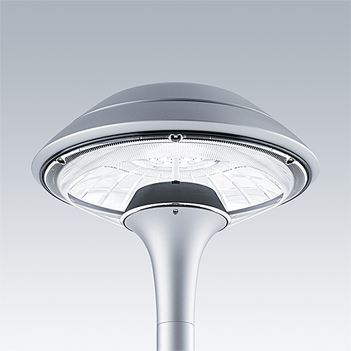 Plurio Direct : Lanterne LED décorative à montage top avec distribution Radialement symétrique. Driver avec 18 LED entraînés à 350mA. Classe électrique II, IP66, IK08. Base : coulé aluminium, thermopoudré gris argent. Chapeau : forme plat, aluminium, texturé gris argent. Diffuseur : anti-UV, transparent Polycarbonate (PC) avec prismes anti-éblouissement. Optique à lentille direct avec réflecteur interne Equipé d'un 50% circuit de réduction de puissance, qui entre en vigueur 3 heures avant et 5 heures après un minuit calculé. Il peut être désactivé à l'installation avec un interrupteur interne facilement accessible. Livré avec LED 4 000 K. Montage top sur mât de Ø 60mm.
