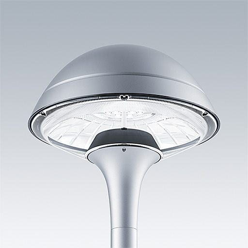 Plurio Direct : Lanterne LED décorative à montage top avec distribution Radialement symétrique. Driver avec 18 LED entraînés à 350mA. Classe électrique II, IP66, IK08. Base : coulé aluminium, thermopoudré gris argent. Chapeau : forme rond, aluminium, texturé gris argent. Diffuseur : anti-UV, transparent Polycarbonate (PC) avec prismes anti-éblouissement. Optique à lentille direct avec réflecteur interne Equipé d'un 50% circuit de réduction de puissance, qui entre en vigueur 3 heures avant et 5 heures après un minuit calculé. Il peut être désactivé à l'installation avec un interrupteur interne facilement accessible. Livré avec LED 4 000 K. Montage top sur mât de Ø 60mm.