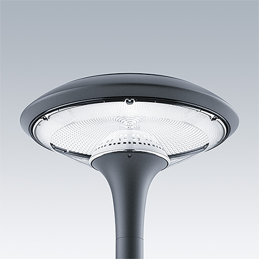 Plurio Indirect : Lanterne LED décorative à montage top avec distribution Radialement symétrique. Driver avec 24 LED entraînés à 250mA. Classe électrique II, IP66, IK08. Base : coulé aluminium, thermopoudré gris anthracite 900 sablé. Chapeau : forme disque, aluminium, texturé gris anthracite 900 sablé. Diffuseur : anti-UV, transparent Polycarbonate (PC) avec prismes anti-éblouissement. Optique à réflecteur indirect Equipé d'un 50% circuit de réduction de puissance, qui entre en vigueur 3 heures avant et 5 heures après un minuit calculé. Il peut être désactivé à l'installation avec un interrupteur interne facilement accessible. Livré avec LED 4 000 K. Montage top sur mât de Ø 60mm.