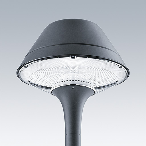 Plurio Indirect : Lanterne LED décorative à montage top avec distribution Radialement symétrique. Driver avec 24 LED entraînés à 250mA. Classe électrique II, IP66, IK08. Base : coulé aluminium, thermopoudré gris anthracite 900 sablé. Chapeau : forme original, aluminium, texturé gris anthracite 900 sablé. Diffuseur : anti-UV, transparent Polycarbonate (PC) avec prismes anti-éblouissement. Optique à réflecteur indirect Equipé d'un 50% circuit de réduction de puissance, qui entre en vigueur 3 heures avant et 5 heures après un minuit calculé. Il peut être désactivé à l'installation avec un interrupteur interne facilement accessible. Livré avec LED 4 000 K. Montage top sur mât de Ø 60mm.