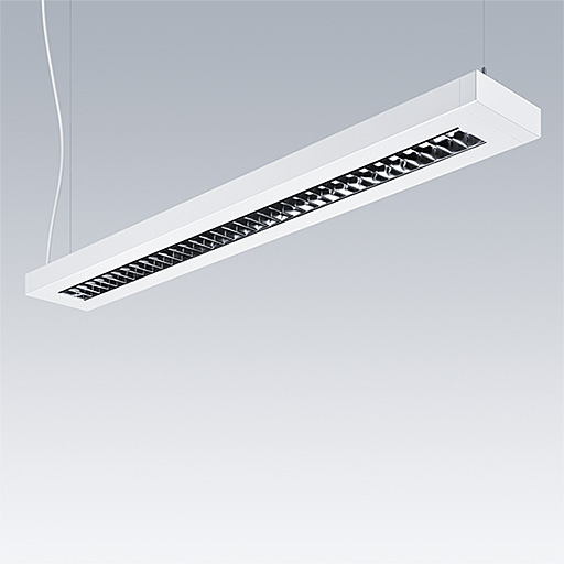 Luminaire suspendu de faible épaisseur avec distribution Direct - indirect. Électronique, gradable DALI circuit d’éclairage de secours, test manuel, 3 heures. Corps : tôle d'acier, thermopoudré blanc (similaire à RAL9016). Embouts : tôle d'acier thermopoudré blanc (similaire à RAL9016). Grille : aluminium brillant. Classe électrique I, IP20, Résistance aux impacts : IK03. Connexion électrique via cordon d'alimentation pré-installé (2.5m). Livré avec LED 4 000 K. Kit de suspension à commander séparément..