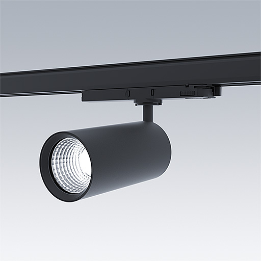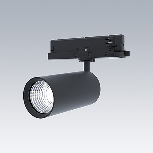 Projecteur LED pour installation sur rail triphasé avec distribution lumineuse de type spot et température de couleur stabilisée. Electronique, non gradable. Classe électrique II, IP20. Corps : aluminium Moulage sous pression, peinture microtexturée noir. Réflecteur : PC poudré. Projecteur orientable sur le plan horizontal de 360° et inclinable sur le plan vertical de 90°. Livré avec LED 3 000 K