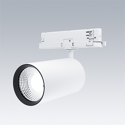 Projecteur LED pour installation sur rail triphasé avec distribution lumineuse de type spot et température de couleur stabilisée. Electronique, non gradable. Classe électrique II, IP20. Corps : aluminium Moulage sous pression, peinture microtexturée blanc. Réflecteur : PC poudré. Projecteur orientable sur le plan horizontal de 360° et inclinable sur le plan vertical de 90°. Livré avec LED 4 000 K